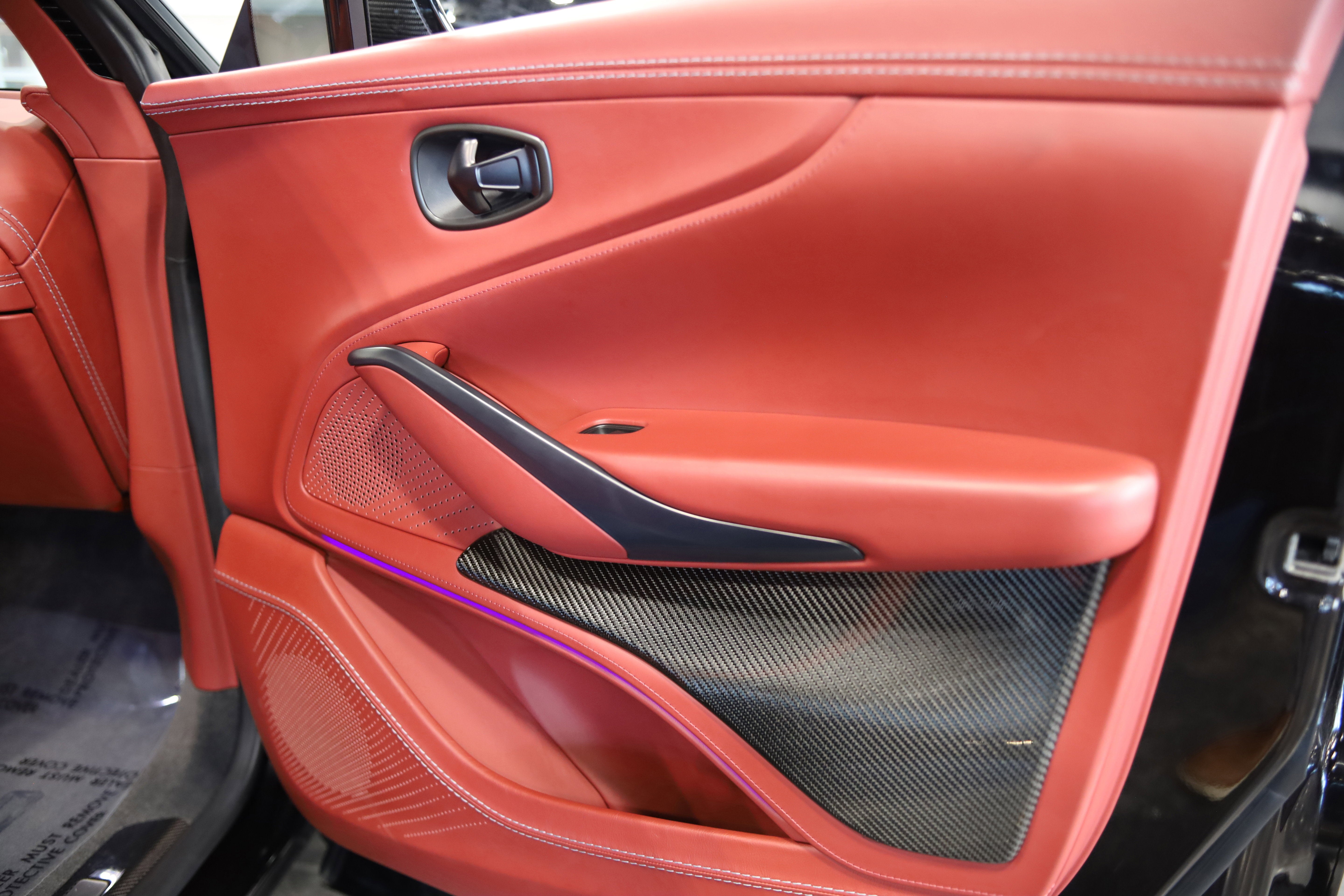 The cabin features a stunning Chancellor Red leather interior, premium materials, and a full suite of modern technology, while the exterior carries Aston Martin's bold, muscular styling finished here in Jet Black. This example includes high-value factory equipment and advanced comfort and safety technologies.